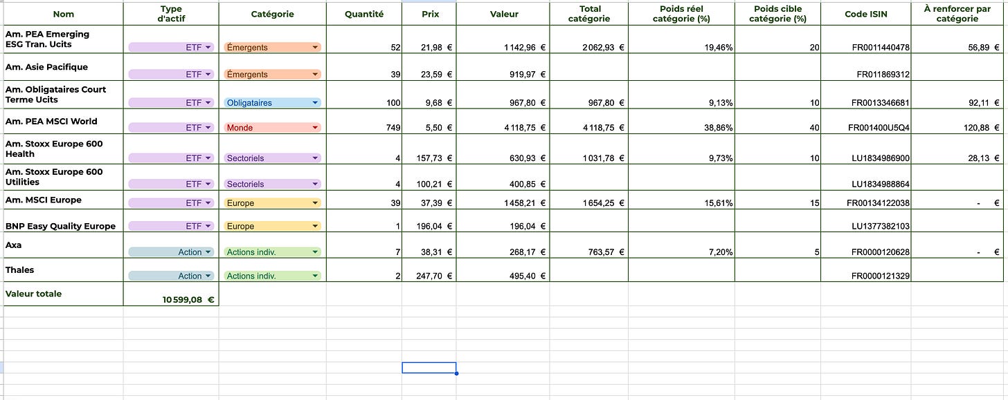 le suivi de tes répartitions en pourcentage par catégories (Monde, Émergents, Europe, Obligations, Crypto, etc.), pour rester cohérent avec ta stratégie,